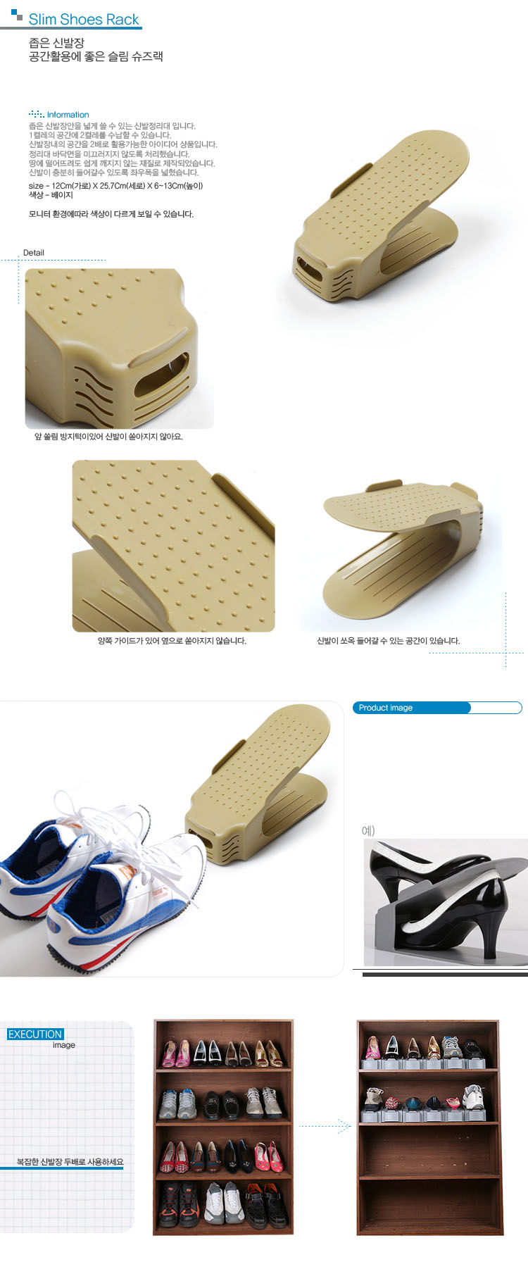 ![]() 제 품 명 : 슬림 슈즈랙 규 격 : 12Cm(가로) X 25.7Cm(세로) X 6~13Cm(높이) 재 질 : 합성수지 특 징 : - 좁은 신발장안을 넓게 쓸 수 있는 신발정리대 입니다. - 1켤레의 공간에 2켤레를 수납할 수 있는 제품입니다. - 미끄럼 방지턱과 가이드가 있어 신발이 떨어질 염려가 없습니다. - 개당 판매하는 제품입니다. - 모니터 환경에따라 색상이 다르게 보일 수 있습니다.